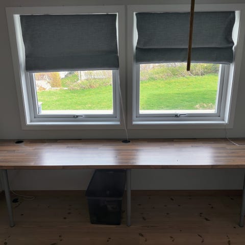 Arbeidsbord brukt til tilskjæring av gardiner. Vannfast finer med aluminiumsramme og bein. Hylle under. Lengde: 340 cm. Bredde: 130 cm. Høyde 82 cm. Pris kan diskuteres.