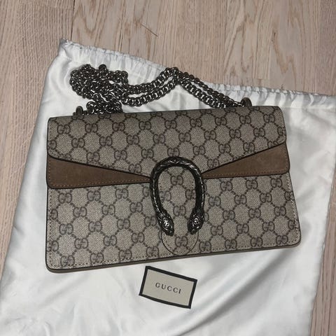 Gucci Dionysus skulderveske i lær med beige og brun farge. Alt fra butikk