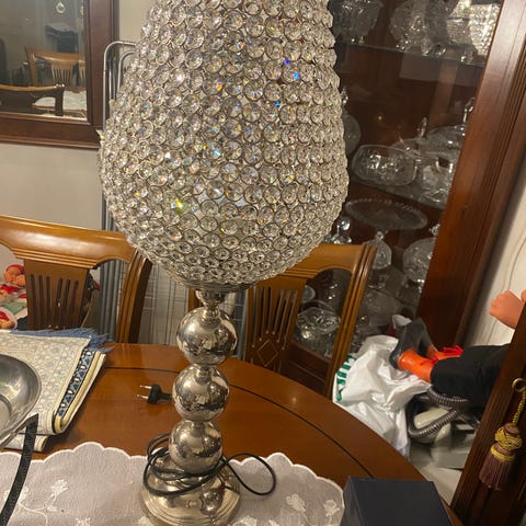 En bordlampe med gråmalt keramikkfot (opprinnelig Høvik) og plissert lampeskjerm fra H&M selges. Høyden er omtrent 45cm/Ø 50cm.