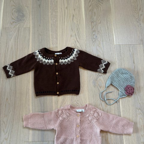 Name it jakke/cardigan i blå farge, størrelse 68. Plagget ble alltid vasket med Milo.