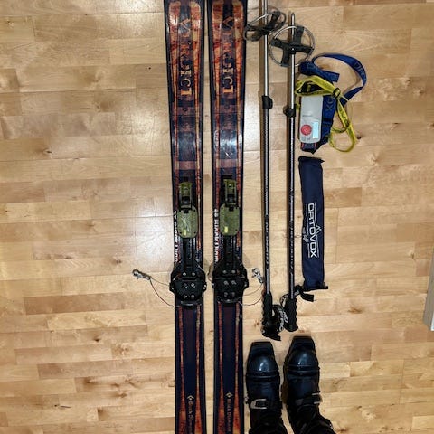 Black Crows Atris birdie med Rottefella Freedom binding, Scarpa TX Pro støvlar str 39 (EUR), G3 feller, og Black Diamond teleskopstavar i aluminium.
