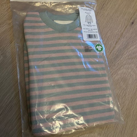 Gul/natur stripet med grå kant. Ull silke. Denne er krympet (mulig også en del mindre i tidligere kolleksjoner fra Nøstebarn), orginalt størrelse 86-92. Tilsvarer nå en størrelse mindre, ca 1 cm lengre enn den rosa i lengde. Misfarget på undersiden av ermet og på mage/bryst. Noe tovet rundt halsen. Fikset hull og slitasje rundt ermeribben. Slitasje rundt knappe nederst som ikke er forsterket.
