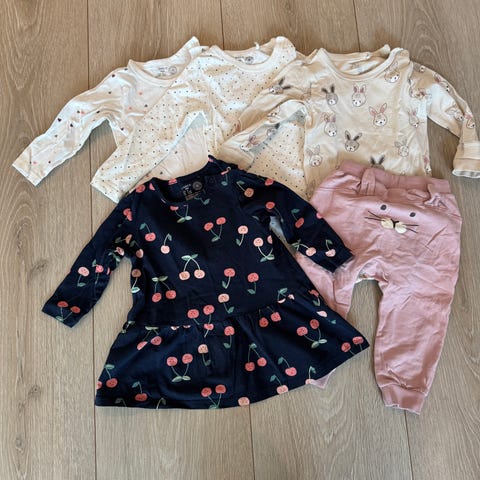 Pent brukte klær i størrelse 74. Mye er brukt av ett barn, noe av flere. Bruksmerker forekommer, men har sortert vekk alt som er ødelagt og utslitt. Newbie, hm og lindex. Alt du trenger minus sokker.