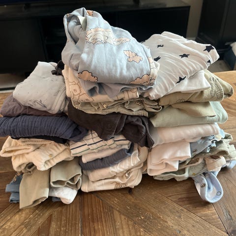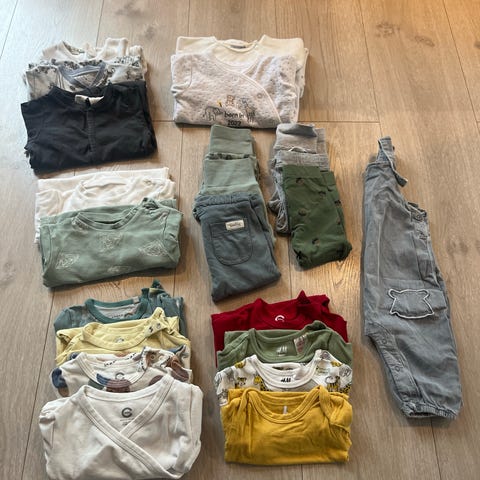 Klespakke i størrelse 68. Inneholder ulike plagg i blå og beige toner, inkludert gensere, bukser, nattdrakter, ulldrakt, caps og bodyer. Plaggene til høyre er ull 😊 Se flere av mine klespakker.