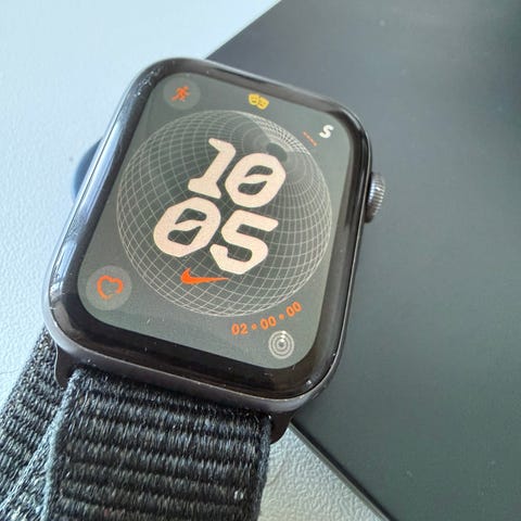 Apple Series 4 Smartklokke med 44mm Space Gray aluminiumskasse og rød Nike sportreim. Klokken har en stor skjerm og er designet for aktivitets- og helseovervåkning. Sportreimen er laget av slitesterkt materiale og er justerbar for komfort.