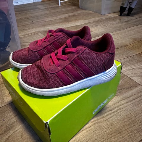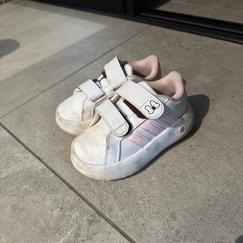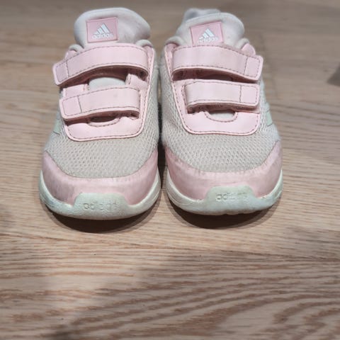 Adidas barnesko for jente i størrelse 24. Skoene er rosa med hvite detaljer. Veldig lette og gode! lite brukt! Kjøpt nye for fullpris i 2025.
