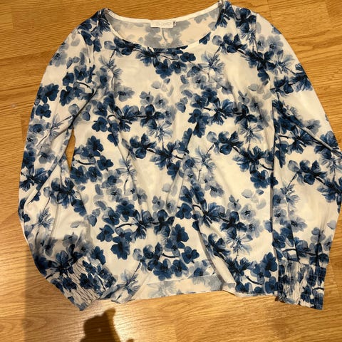 Nydelig og nesten ubrukt bluse fra Floyd str.XS. Hvitt og litt gjennomsiktig stoff ytterst med hvite prikker. Ekstra lag med hvitt stoff under slik at den kun er transparent på ermene.