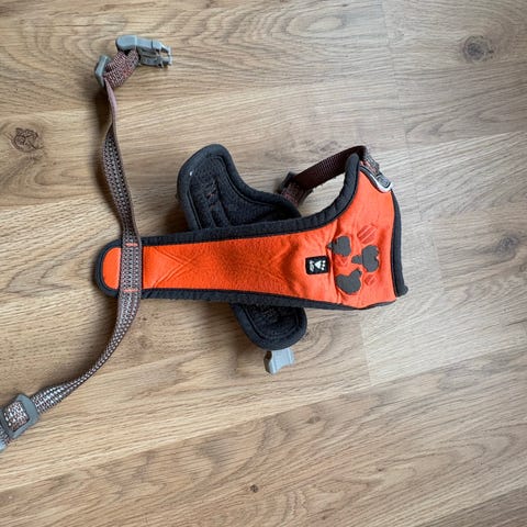 Non Stop Y-Sele Hundesele i oransje og svart farge. Laget av slitesterkt materiale med justerbare stropper for tilpasning. Designet for komfort og sikkerhet ved tur med hund. Passer til hunder på 6 +/- kg. Vært brukt av en dverg dachs.