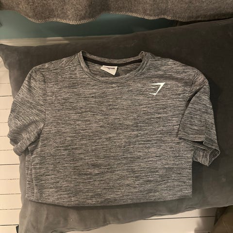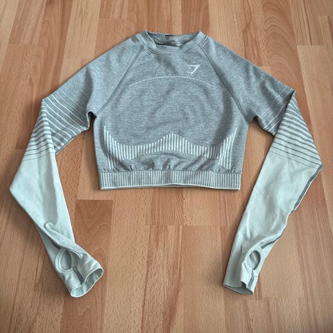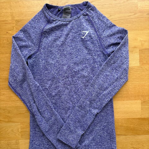 Gymshark langermet treningsgenser i størrelse XS. Jeg er ikke 100% sikker på størrelsen da lappen er klippet av, men den er sannsynligvis XS.
