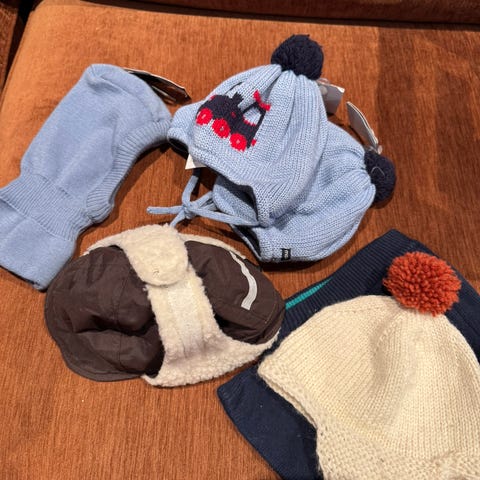 Selges samlet Merinoull hettelue og diverse luer i størrelse 1-2 år.