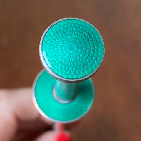 En flott gammel sukkerklype/isbittang med en blomst i gul og grønn emalje på toppen. Tangen er 11 cm lang og fungerer utmerket. Veldig flott farge som jeg vil si er litt grønnere i virkeligheten.