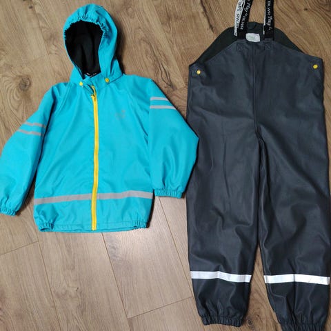 Veldig pent brukt 2delt regnsett: regnjakke og regnbukse. Størrelse 120 (122). Varm fleece i halsen/nakken. Ingen hull, minimal/ikke synlig slitasje.