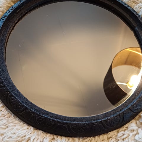 Pent dekorfat med speil. Fint å ha på feks badet med parfymeflasker eller i stua med lys/blomster på. Helt og pent. Ingen skader.