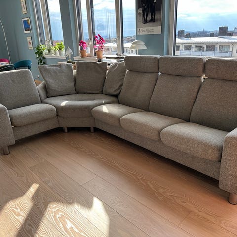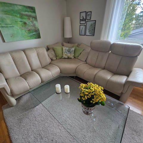 Sofa har lenefunksjon. Noe slitt, men fullt brukbart.
