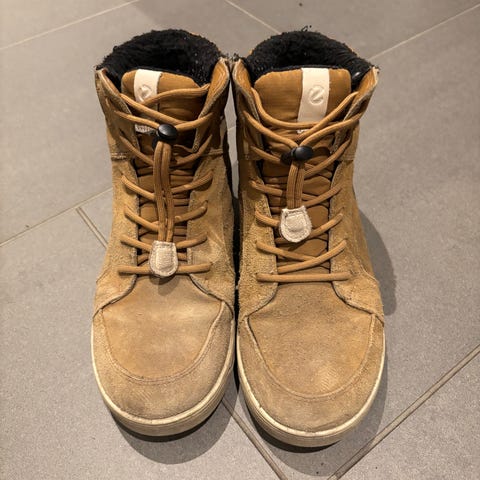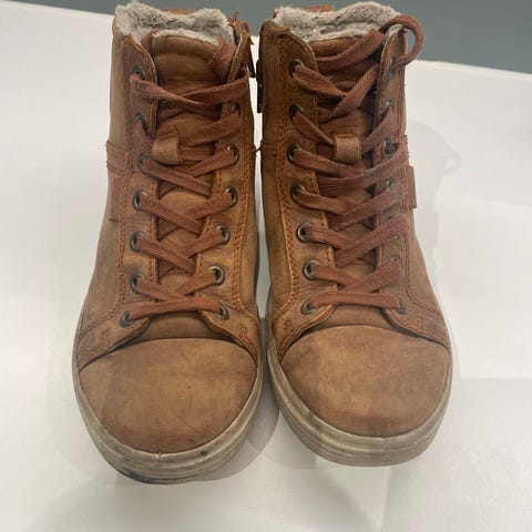 Må hentes, sender ikke. Ser mer slitt ut enn de er pga fargen. ECCO unisex barn sko i størrelse 36. Laget av grått semsket skinn med borrelås for enkel justering. Skoene har en hvit gummisåle og er designet for komfort og holdbarhet.
