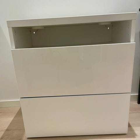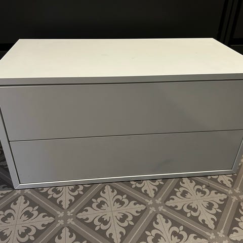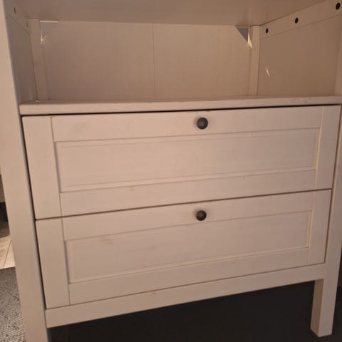 Selger en hvit kommode med to skuffer fra IKEA. Noen bruksmerker, men i god stand. Selges for 300,-