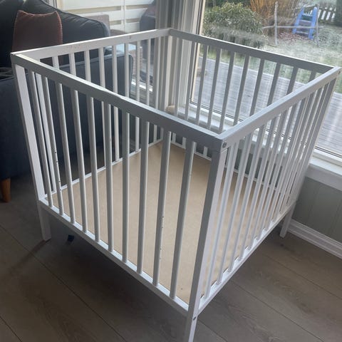 Lekegrind / dagseng hvor bunnen kan justeres i to nivåer. Kjøpt nytt for 2400 kr inkl. mykt teppe. Selges samlet for kr 800. Noen få bruksmerker som vist på bildene. Mål på 80*100.