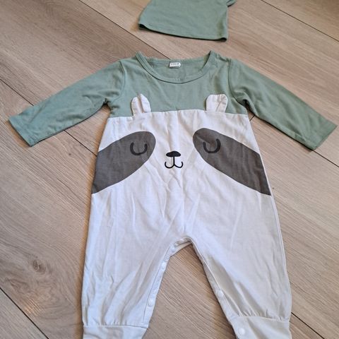 Blå og hvit drakt m knapper foran og i skrittet (str. 68) Drakten har lang krage bak.