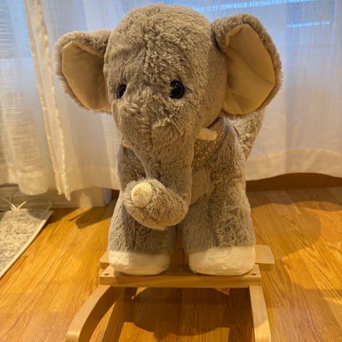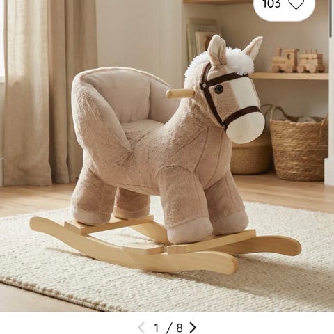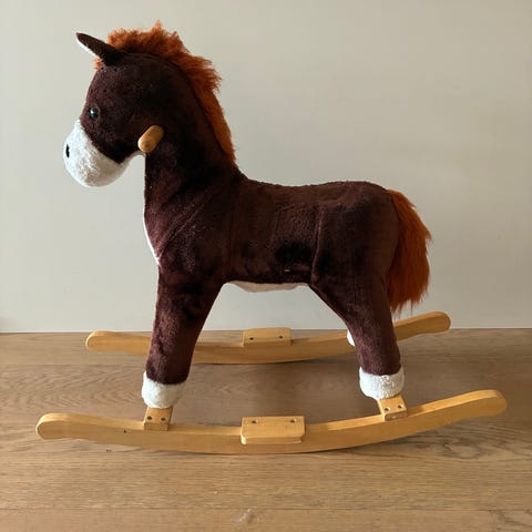 Veldig fin og unik dino-gyngehest selges da barna har blitt for store til den. Begge barna har vært veldig glade i den og det er mange timers god lek i den. Har bjælde og knitrepapir i seg og fylt under beina.