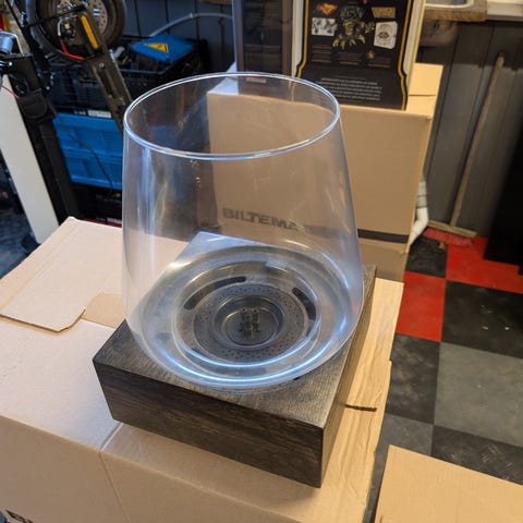 Stor bordlykt med eikebase fra Tenderflame. Mangler brenselbeholderen/veken, men kan brukes som en fin bordlykt!