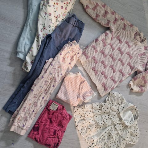 Klær i utrolig kvalitet fra norske Memini. Bukse og rumper med blomstermønster, buksa er ikke brukt, shortsen er brukt én gang. Buksa i str 92 og shorts i str 86. Ulljakke i str 92, pent brukt. Strømpebukser fra Gullkorn som passet i samme periode og er så fin farge til resten. Nypris over 1300 kr.