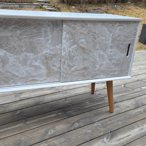 Selger en spesiallaget TV-benk satt sammen av tre IKEA EKET-hyller. Perfekt for deg som ønsker noe personlig og gjennomført i stua.