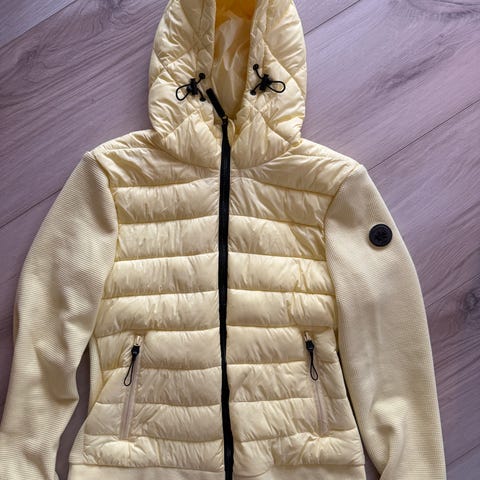 Ledig vattert jakke i 100% resirkulert, ytterstoff, fôr og vattering med fine quiltede detaljer. Jakken har høy krage, elastikk nederst på ermet, lommer med trykknapp ,logobadge på ermet og logotrykknapper i front. Helt nytt.