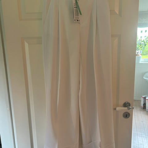 Super fin vinterhvit bukse, high waist, wide leg, ben inner lengde 78cm. Flott til vår, høst og vinter. Pris i butikk 2599,-. Brukt kun 2 ganger. 55%ull, 45% polyester.