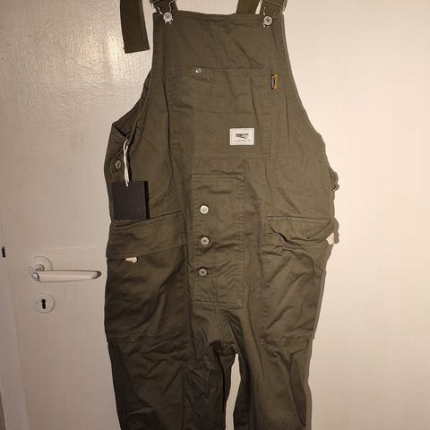 Snekkerbukse i blå farge, størrelse 46 for kvinner. Laget av denimmateriale med justerbare skulderstropper og flere lommer foran og bak. Designet med metallknapper på sidene for enkel åpning og lukking. Passer til hverdagsbruk.