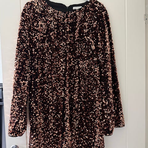 Gestuz Romy Dress festkjole i brun farge, størrelse M. Kjolen har paljetter over hele plagget, 3/4 lengde ermer og glidelås bak. Materialet består av 100% polyester med foring i 100% polyester