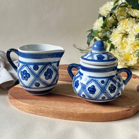 Søkeord: kjøkkenutstyr servering dekorasjon pynt kjøkken dekor pyntegjenstand styling interiør porselen kvalitet hvit moderne mønster dekorativ borddekorasjon cottagecore cottage core sausskål blå blått hvit hvitt hank håndtak blomstermotiv blomster motiv blomsterdesign