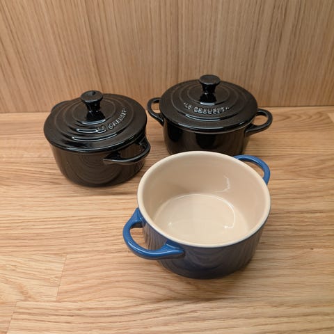 Le Creuset 10 cm Mini Gryter 2-pakning i rød og oransje farge. Hver gryte har lokk og to håndtak for enkel håndtering. 500 pr 2 pack.