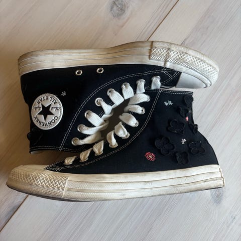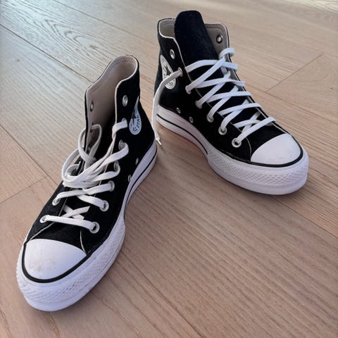 Converse All Star sneakers i størrelse 37, laget i rødt stoffmateriale. Skoene er unisex med klassisk design og gummisåle. Passer til daglig bruk og ulike fritidsaktiviteter.
