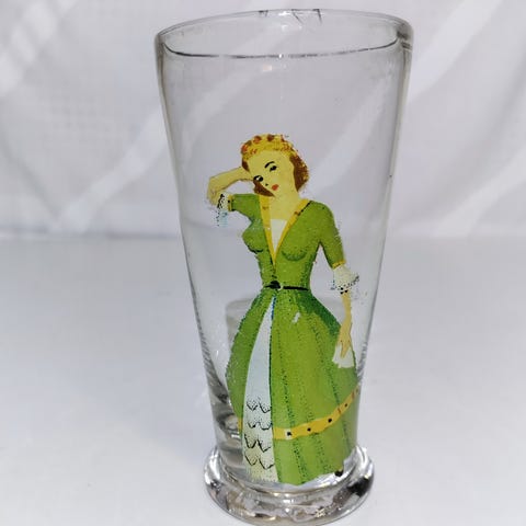 Glassene er skadefrie, men damen på det ene glasset mangler føttene. To av damene er nakne inni glasset.