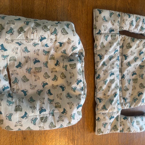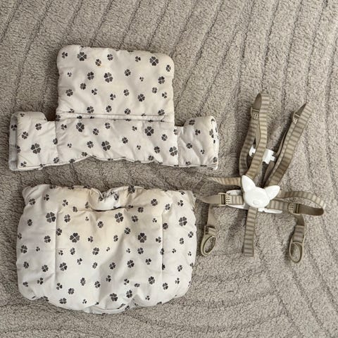 Stokke babyfeste og ryggstøtte med pute tilbehør bestående av sete og ryggpute og beskyttelse med mønster i nøytrale farger. Setetilbehøret er laget for å gi ekstra komfort og beskyttelse til barnestolen. Materialet og designet er tilpasset for bruk i barnestol, med fokus på funksjonalitet og enkel rengjøring.