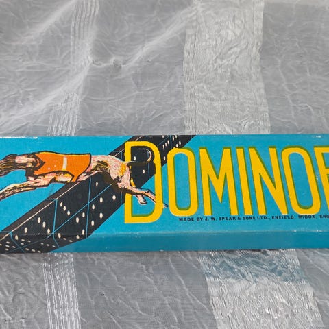 Antakelig dansk produksjon fra 1950–60-tallet. Kassens lokk har grønn trykkdekor med store bokstaver DOMINO og illustrerte brikker.