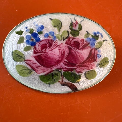 Emaljebrosje fra Arne Nordlie med blomstermotiv og filigranbord. Brosjen er pent brukt uten synlig slitasje. Mål: 3 x 2,5 cm. Materiale: Sølv 925 S og emalje.