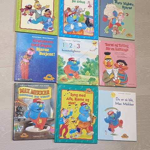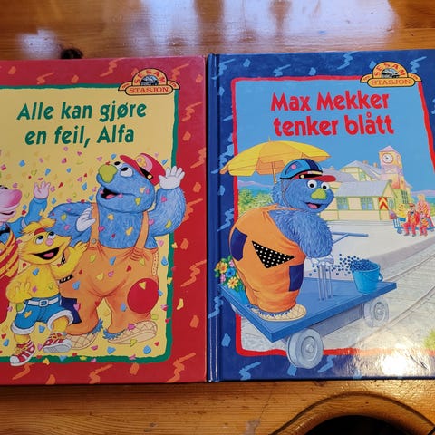 Sesam Stasjon barnebøker med titlene 'Når er det søndag?', 'Max Mekker tenker blått', og 'Hvem vinner førstepremien?'. Bøkene inneholder kjente karakterer fra Sesam Stasjon og er egnet for barn. Innholdet er på norsk, med fargerike illustrasjoner og enkle historier.