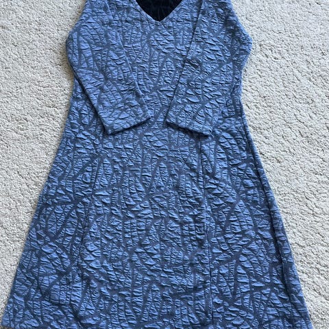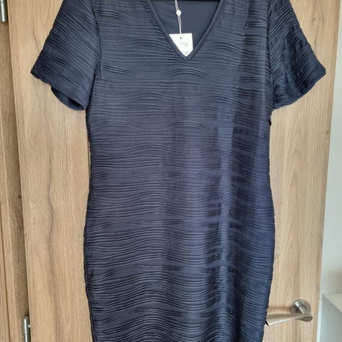 Kjolen har strukturert stoff med horisontale bølgende linjer som er veldig flatterende. Ermer med trekvart lengde.