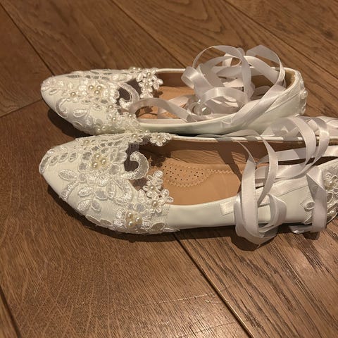 Helt nye, ubrukte brudesko selges fra Asos i str 40. Kun blitt prøvd på (kan se noe limrester på siste bilde, men ikke noe som synes når du har på skoen). Selges da fargen ikke matchet kjolen jeg skulle bruke for anledningen.