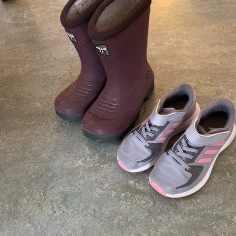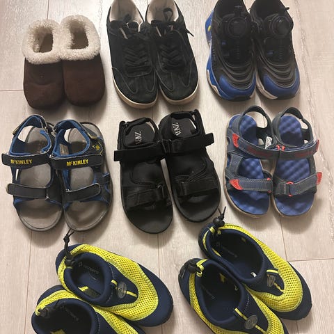 1 par sandaler i størrelse 31 og 1 par fotballsko (puma) størrelse 31, 1 par overgangssko (okaki) størrelse 32 og 1 par tursko (størrelse 33).