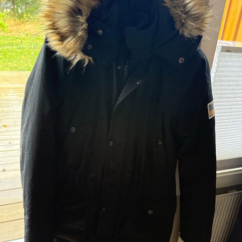 Høy krage og hette med avtagbar fuskepelskant. Ribbestrikket innvendig vrangbord i ermekant.