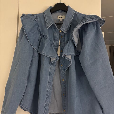 Ellos skjorte i denimmateriale, blå farge, størrelse 46/48 for kvinner. Skjorten har lange ermer med knappet mansjett, trykknapper foran og to brystlommer.