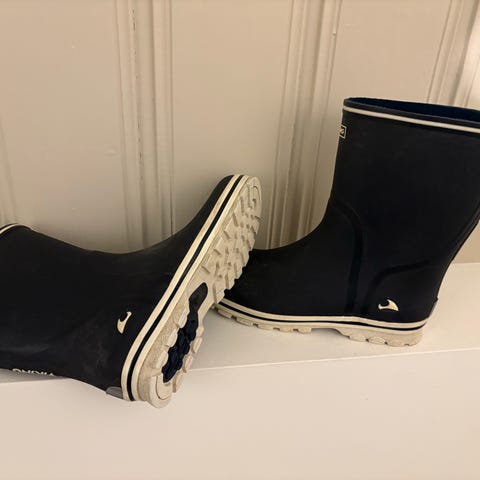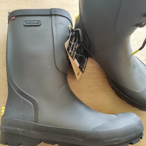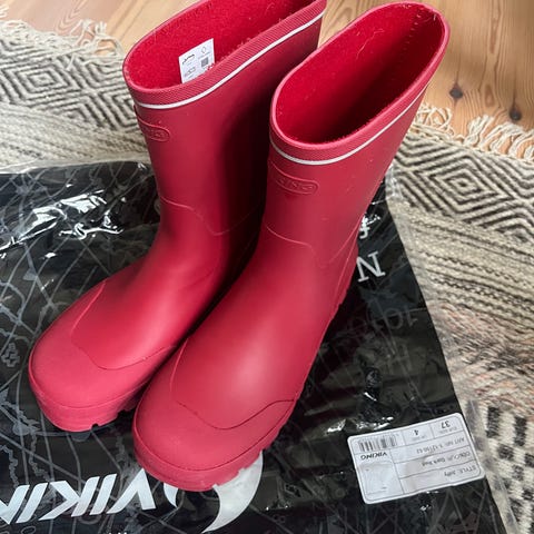 Viking barne gummistøvler for unisex, størrelse 37. Støvlene er blå og laget i vanntett materiale som egner seg for bruk i vått vær. Designet for å gi beskyttelse og komfort til barn ved utendørs aktiviteter.