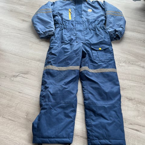 Mellomblå & svart. Glidelås som kan åpnes i beina. Flere lommer, reflekterer og avtagbar hette.