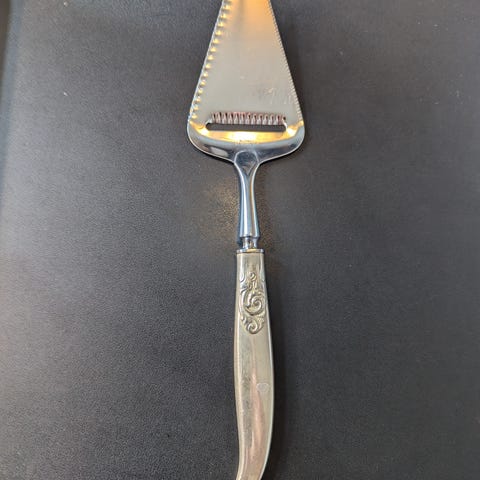 Selger en kjempefin ostehøvel i 830 S. Litt usikker på navnet på mønsteret. Skaftet er i sølv , men selve høvelen er i stål.