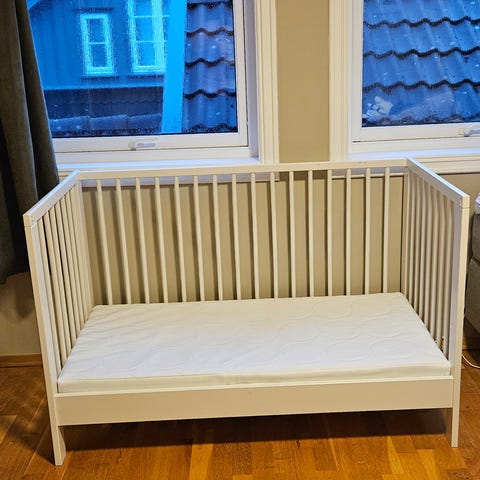 Sengen er i furu. Høyde 85 cm lengde 125 cm bredde 64 cm.. 2 stk madrasser, pute og dyne samt trekk følger med.