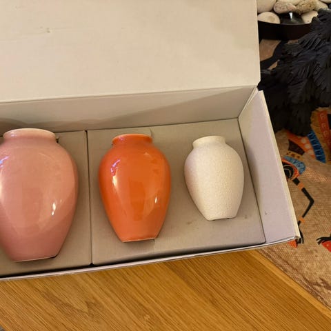 3 vaser inkl blomstene selges. Kahler vase, 2 vaser fra mester grønn. De brune (skinnaktig ) pynten er fra Spania kjøpt i interiørbutikk