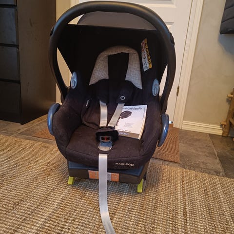 Pent brukt barnesete med base brukt i bestemors bil. For barn opp til 13 kilo. Selges kr 300,-kr