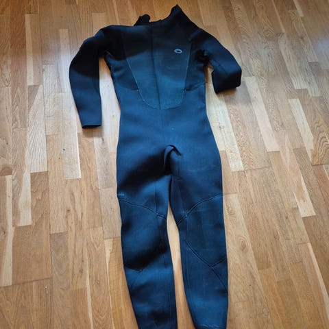 våtdrakt laget av neoprenmateriale. Kun brukt på et surfekurs. Drakten har svart og blå farge, hel glidelås foran og er designet for vannsportaktiviteter.